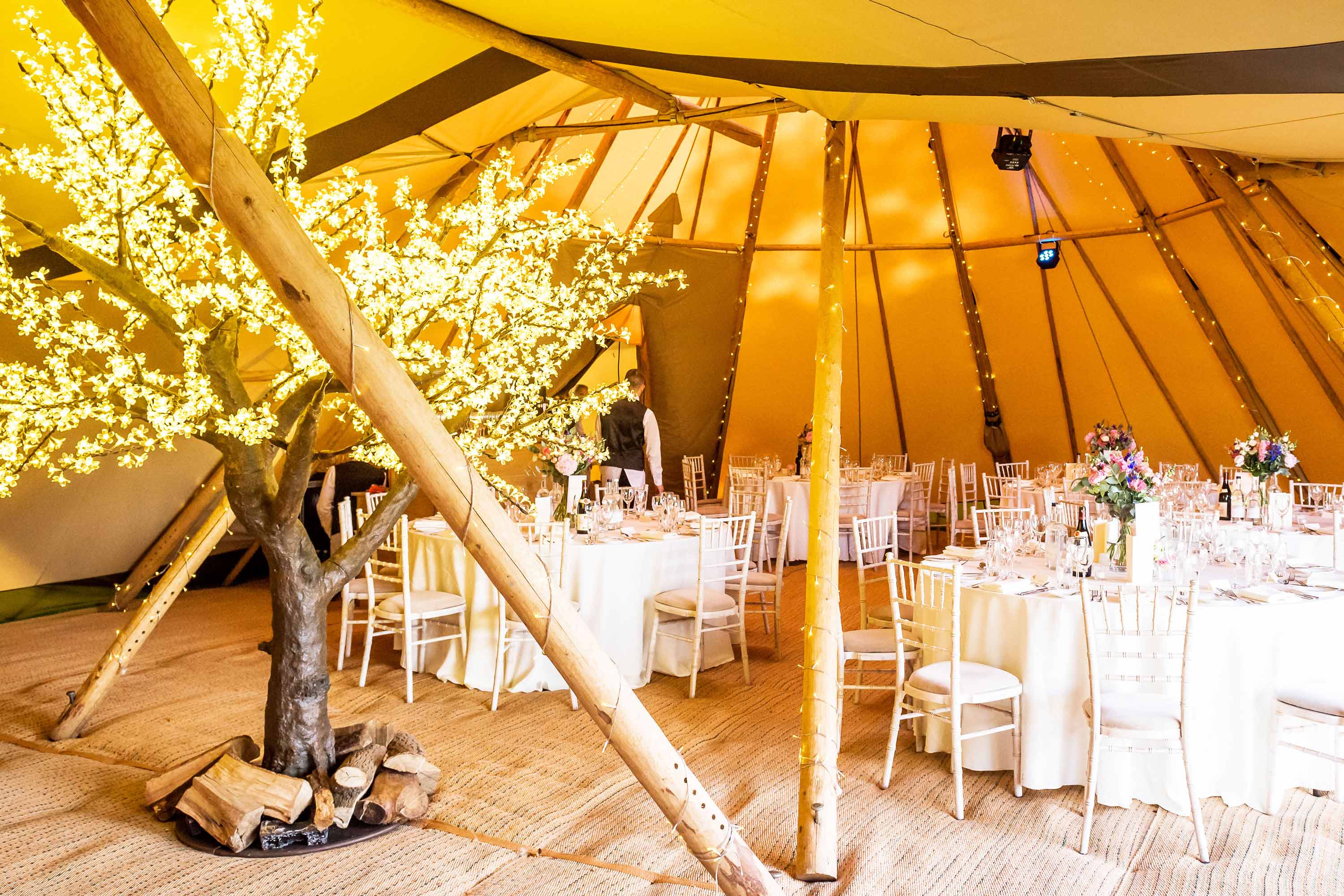 To decorate the tipi, we provided our LED Blossom Tree, this sat in the centre of the tipi and was visible from the outside to invite guests in. We provided our Limewash Chiavari Chairs, 6ft Round Tables and Table Linen for the area where guests would eat their meal. Our Event DJ set up on the other side of the tipi with the 15ft x 15ft Parquet Dance Floor and the Magic Selfie Mirror.
