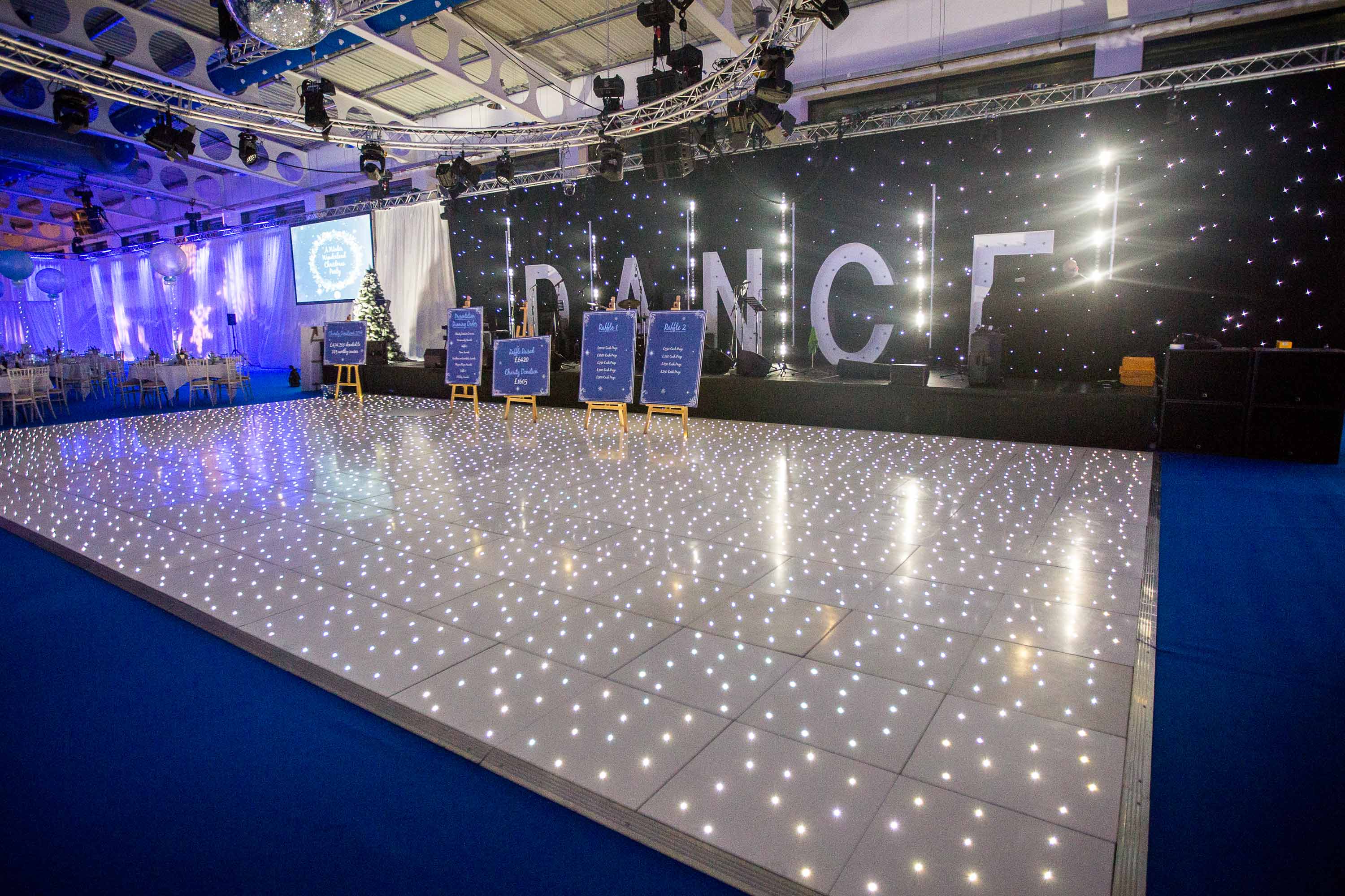 A 46ft x 28ft white starlit dance floor was laid by the Premier team, with 168 panels to individually install this was a lengthy process but the final result looked superb and it was well used when the DJ and band performed.