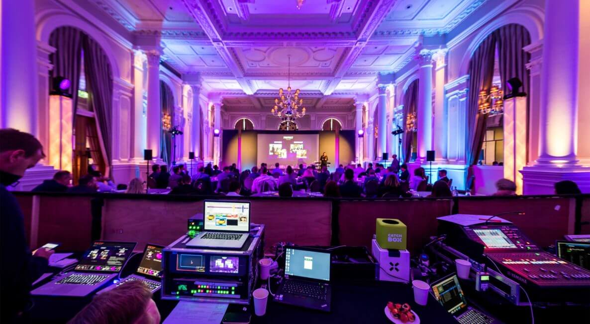 Due to the venues high ceilings our Production Team installed a 12ft tall set backdrop to provide a more intimate feel to the event. This included a 16ft x 9ft projection screen and a 30k Lumen projector for bright, vibrant PowerPoint and video presentations. They also installed a 9m x 2m stage at 0.3m tall to make sure the presenters were raised off the ground, ensuring guests were able to see them clearly.