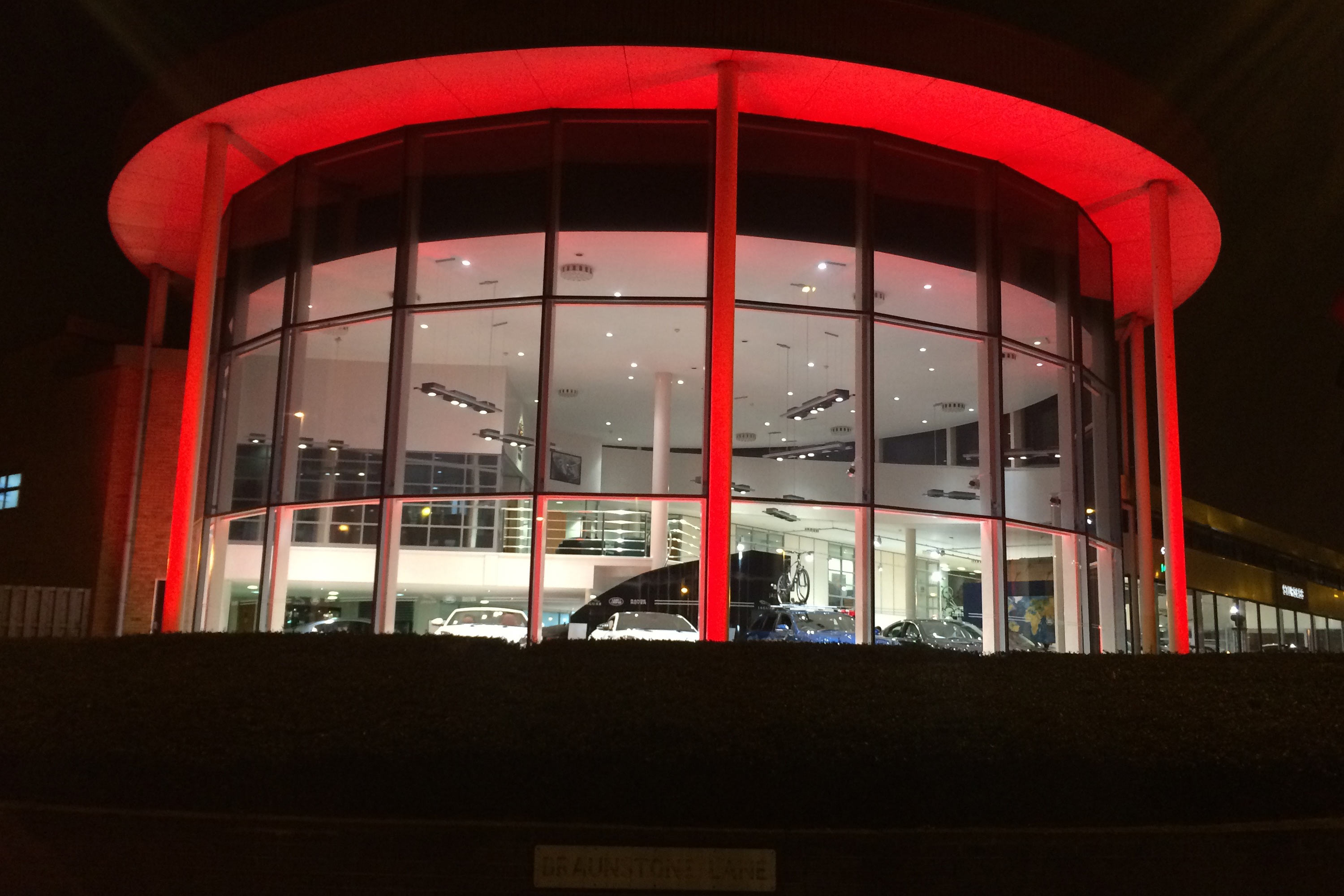 To illuminate the Jaguar side of the showroom externally we used 6 of our high-powered LED floods set to red, which looked very effective.