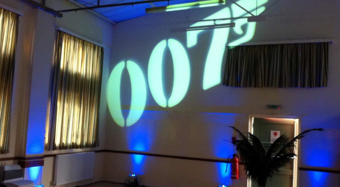 As it was a James Bond themed event we also used 2 of our moving heads which we positioned on the stage with a custom made 007 gobo inside it. We directed one of the beams of light from the moving head onto the far wall of the venue where the 007 gobo stayed on all night. The second light we programmed to slowly pan around the venue displaying the 007 logo.